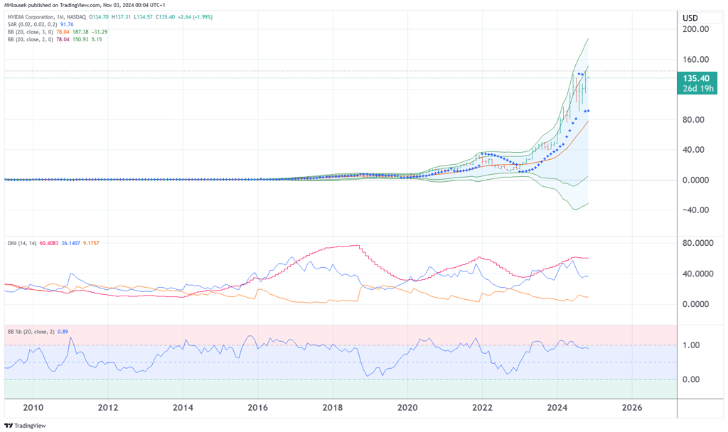 NVDA im Monthly Chart. Einstiege wären 2014, 2020 und 2023. Könnte man den ganzen Anstieg mitgenommen haben? Anhand der hohen ADX Levels 2017 und 2018 hätte man z.B. Teilverkäufe machen können. Ebenso Ende 2021.