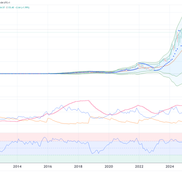 Directional Movement Index (DMI) mit ADX (Average Directional Index) - Dieser befindet sich im unteren Teil des Charts. Der DMI besteht aus +DI (positiver Richtungsindikator) und -DI (negativer Richtungsindikator), die die Trendrichtung anzeigen, während die ADX-Linie die Stärke des Trends misst.